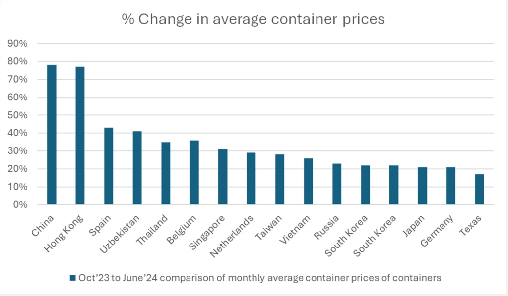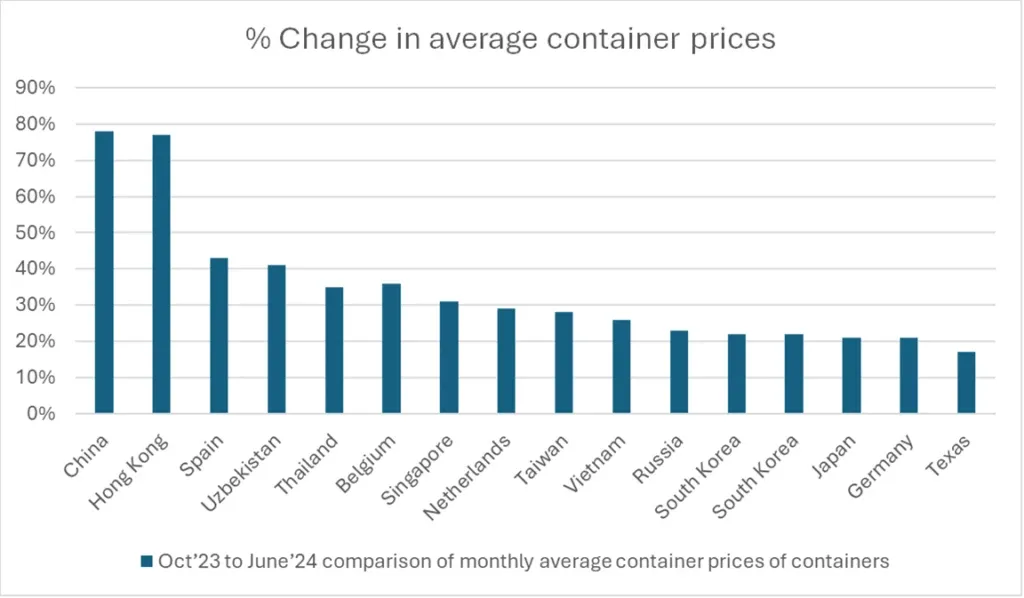 India also faced a rise in average container prices spiking by 21% from May to June 2024. In Singapore, while there has been a steady rise of 31% in container prices since October 2023, the increase from May to June 2024 was a more moderate 7%.