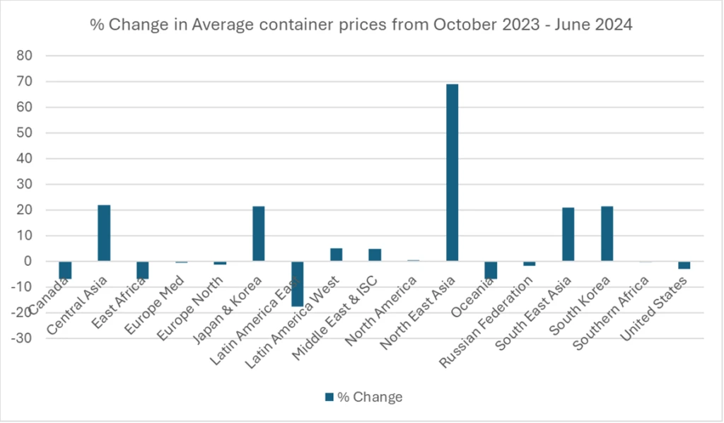 Northeast Asia region witnessed the biggest price increase of 69% since October 2023, with China, Hong Kong and Taiwan registering significant price hikes, indicating robust demand for containers.