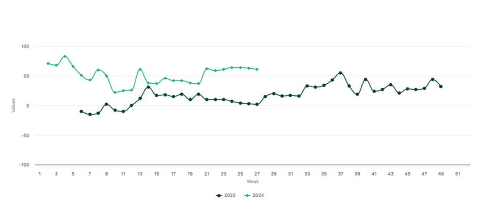 The first half of 2024 saw the Container Price Sentiment Index (xCPSI) reach an all-time high, and it remains elevated throughout the last six months, indicating a strong sentiment for rising container prices expectations in the upcoming second half of the year.