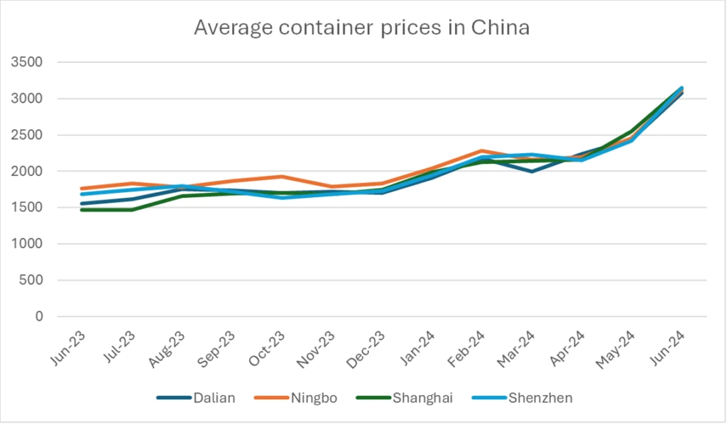 “From January to June of 2024, containers in the North American market were in a state of clearing inventory and prices showed signs of rising. It will continue to rise in the next few months, which is in line with the increase of container purchase price in the Chinese Mainland. The high cost of container procurement and container leasing lead to almost no difference between SOC freight and COC freight. Based on this performance, the lack of containers in some cities in North America is inevitable, which will drive up the sales price of containers.”
