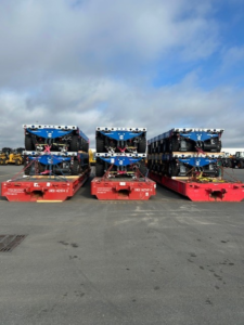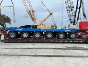 EurBridge Logistics USA, a member of the Mega Move Alliance (MMA), is currently handling a heavy cargo shipment from Germany to a U.S. naval shipyard in Mobile, Alabama. The cargo includes eight 6-axle Self-Propelled Modular Transporters (SPMTs), four Power Pack Units (PPUs) and multiple parts crates.